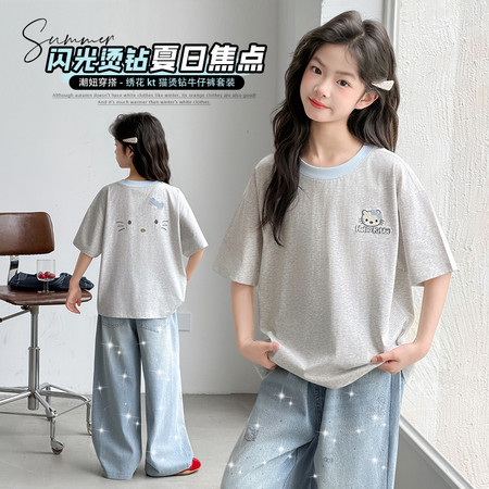 丫豆童装&绣花KT猫烫钻牛仔裤套
