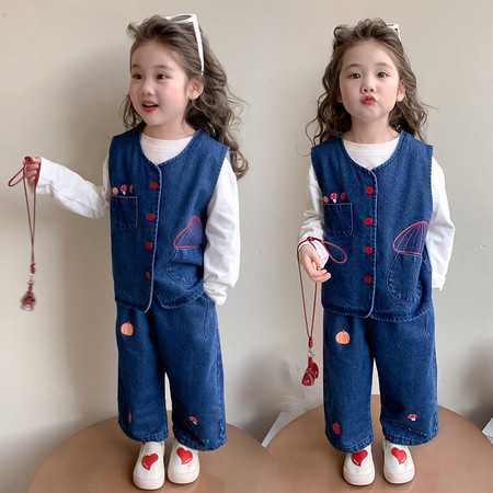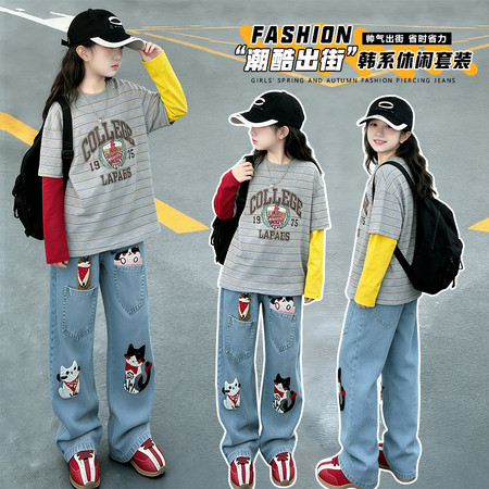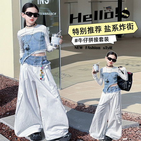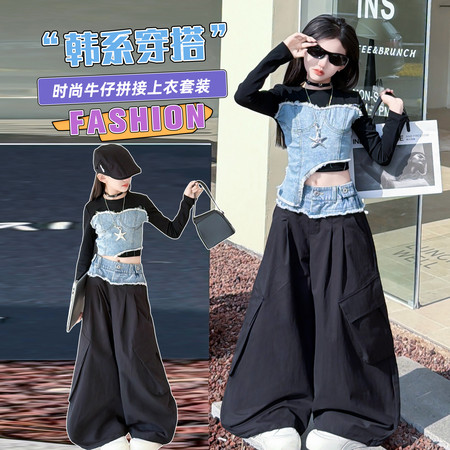 七色雨&2603爱心蕾丝黑白格牛仔裤套装