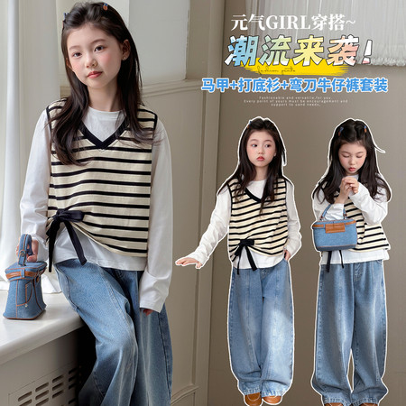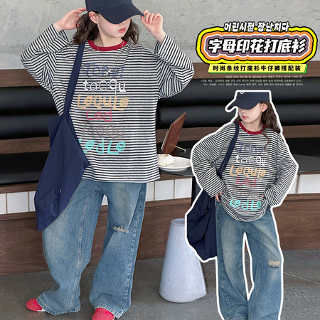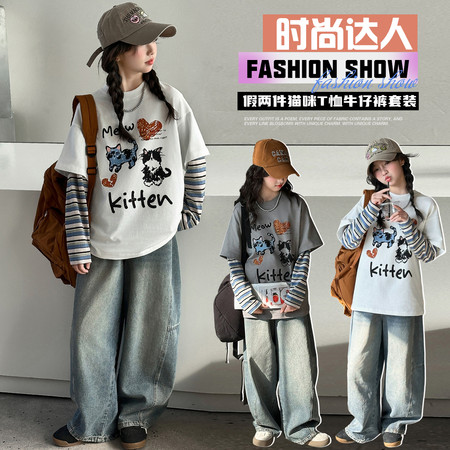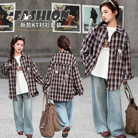七色雨&2601格子猫咪衬衫牛仔裤套装