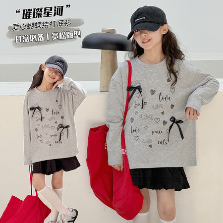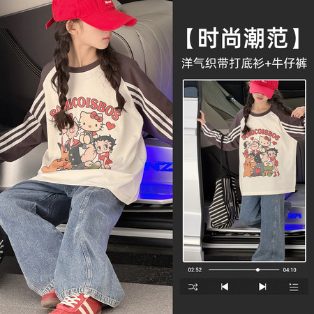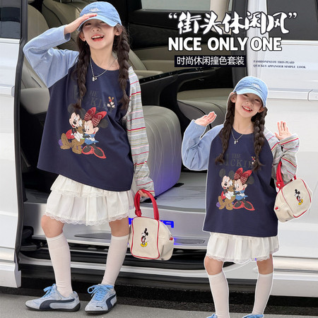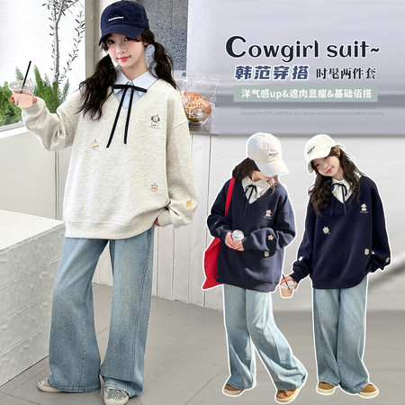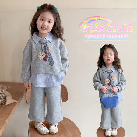 米咔精灵&66027卡通绣花衬衫领假两件卫衣套装