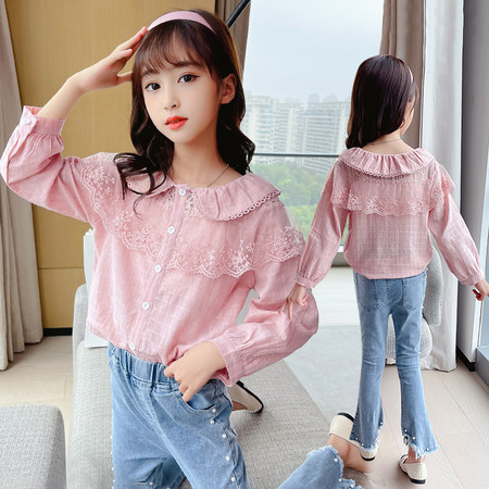 星星年华&DX03667粉色花边衬衫和珍珠牛仔裤