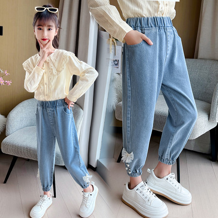 星星年华&DX03723裤脚蝴蝶结钉珠休闲牛仔裤