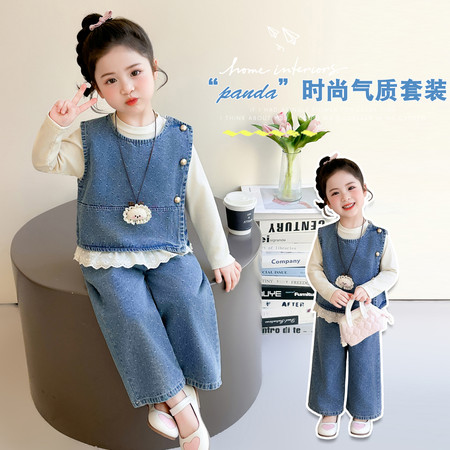 漂亮优贝童装&2926款不规则花边衬衫烫钻牛仔裤两件套