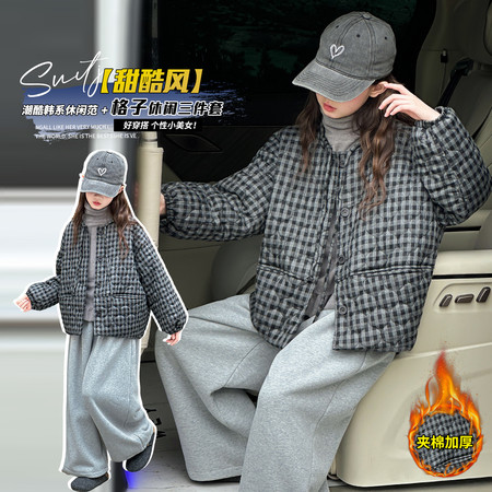 珊妮童装&2571-1格子衬衫毛衣背心牛仔裤套装