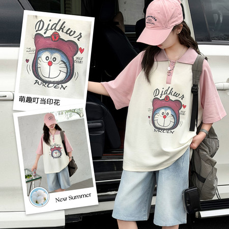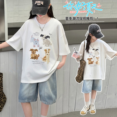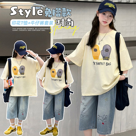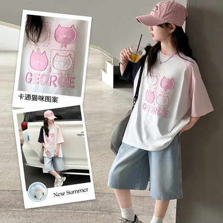 夏上新 现货 上衣双纱面料 卡通猫数码印花T恤+屁连牛仔中裤新