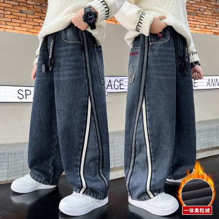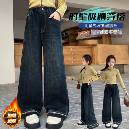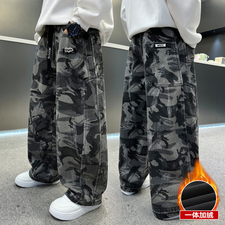 南瓜街&761款豹纹翻边加绒牛仔阔腿裤